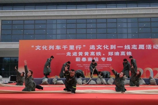 在黃黃高鐵蘄春南站、鄭渝高鐵興山綜合維修車(chē)間、浩吉鐵路襄州運(yùn)營(yíng)維修段舉行的三場(chǎng)活動(dòng)亦是精彩紛呈。由牛悅敏、候孟陽(yáng)、白石洋、李祥東、白愛(ài)潔、徐寧、王曉萍、周政輝、胡啟文、朵蘭、王瑛、蔣輝、以及幾十位武漢局集團(tuán)公司文藝志愿者的精彩節(jié)目輪番上演。優(yōu)美動(dòng)聽(tīng)的歌舞、經(jīng)典優(yōu)美的京劇、詼諧幽默的大鼓、驚險(xiǎn)刺激的雜技,還有《朱家河上的守堤人》等情景劇感人至深,活動(dòng)現(xiàn)場(chǎng)濃厚的文藝氛圍感染著每一位觀眾。本次活動(dòng)惠及鐵路沿線車(chē)務(wù)、機(jī)務(wù)、工務(wù)、供電、電務(wù)等系統(tǒng)職工和高鐵列車(chē)旅客3500余人。