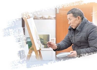 一手托著調色盤,一手舉著畫筆,眼前一個畫架,陳云發(fā)常常沉浸在自己的創(chuàng)作中。過去,陳云發(fā)以種田和做泥瓦工為生。藝術區(qū)建設期間,陳云發(fā)家中的幾間房子被張佰橋租來存放畫具。藝術家們創(chuàng)作時,陳云發(fā)也在旁邊看。后來,張佰橋送給陳云發(fā)一套畫具,“感興趣,就跟著學!”