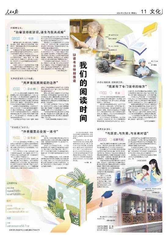 閱讀是什么?是一頁一卷,傳承千年文脈;是出行忙碌,隨身攜帶的星辰大海;是廣袤山鄉(xiāng),指引孩子們成長的燈塔;也是靜謐時光,陪伴無數(shù)個日夜的詩和遠方……第二十九個世界讀書日,我們關注多種多樣的閱讀時間,這些鮮活的場景展現(xiàn)著當下人們閱讀生活的方方面面。讓我們從不同行業(yè)、不同年齡的讀者視角,感受文明的印記,見證時代進步的力量。