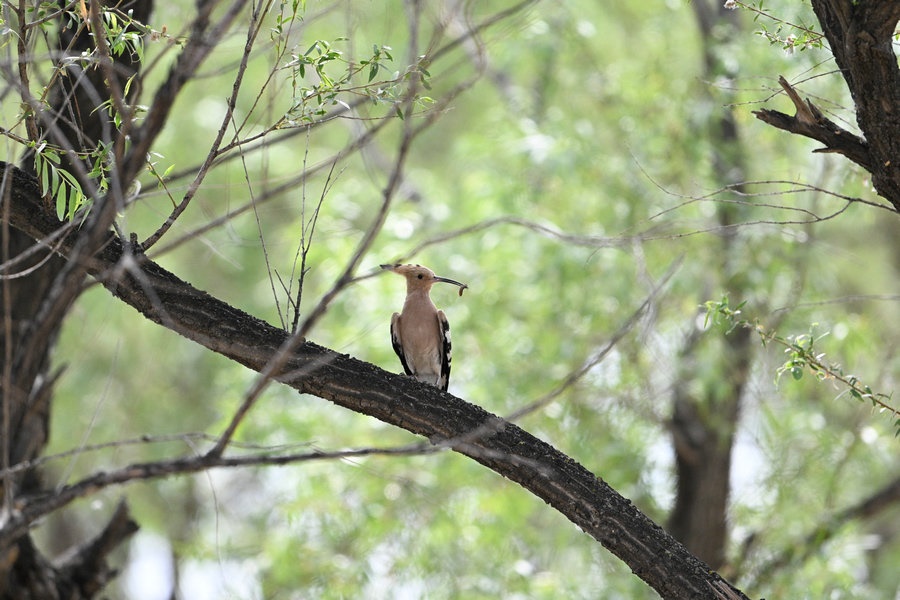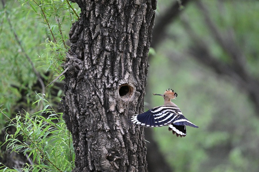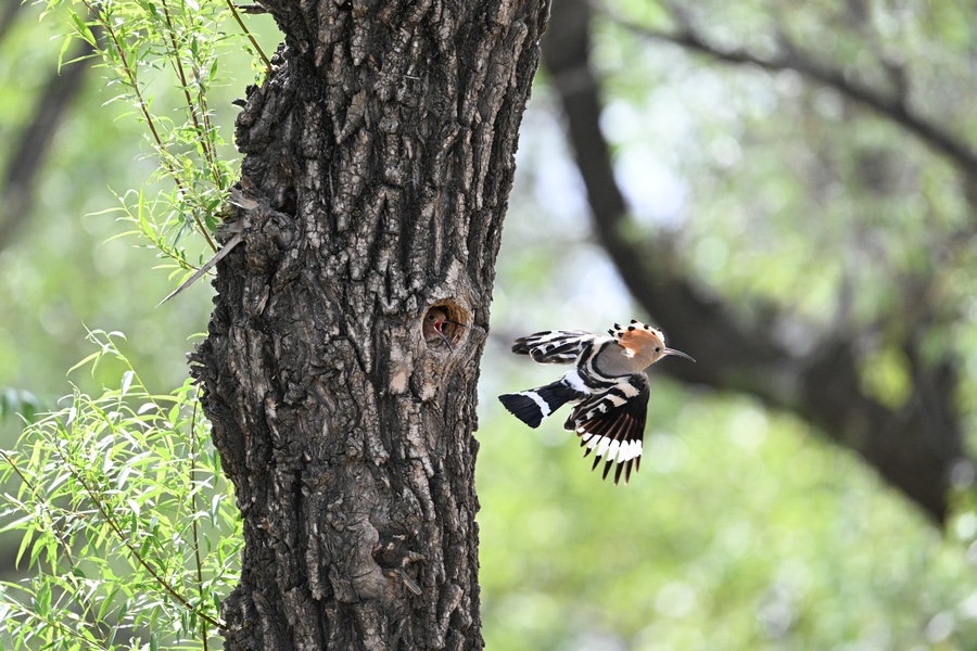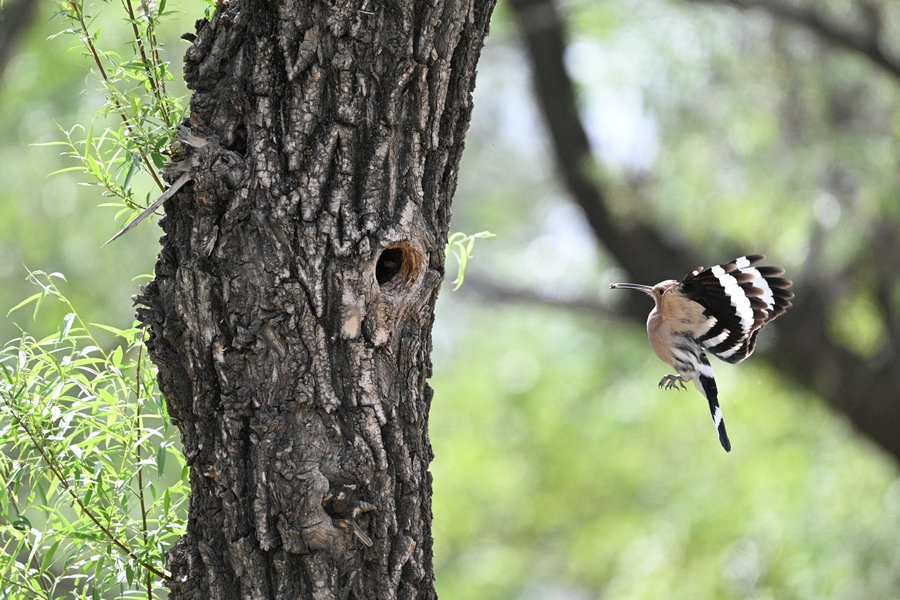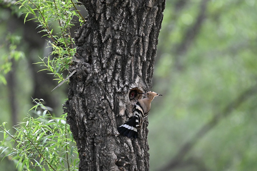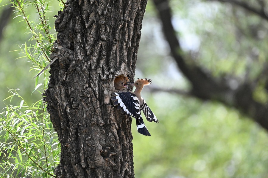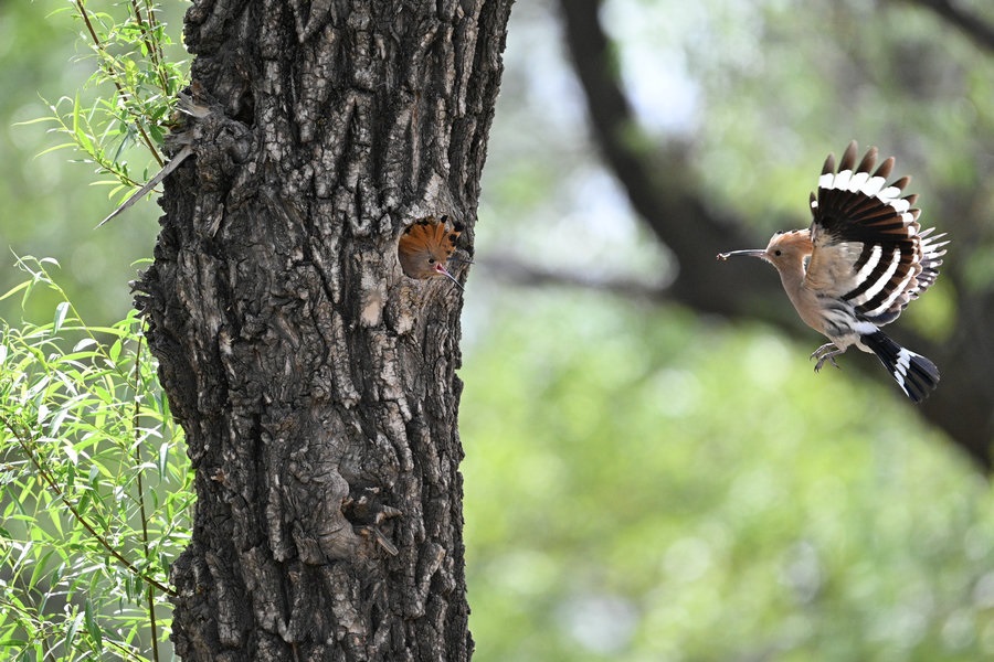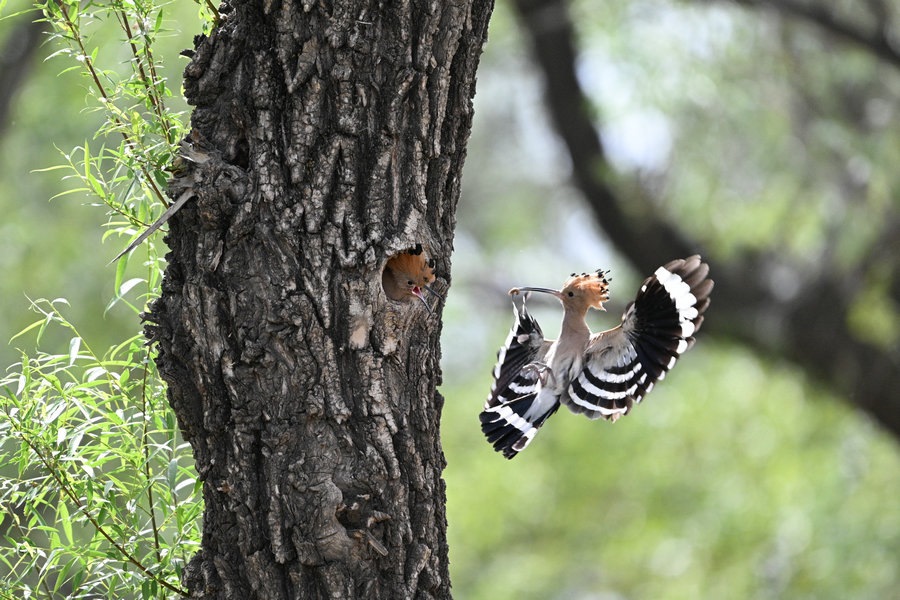 6月4日,呼和浩特市玉泉區(qū)大黑河沿岸,戴勝鳥在樹林、草叢中覓食,捉到蟲子飛回窩喂給鳥寶寶,3個小時內(nèi)往返數(shù)十次。吸引了眾多攝影愛好者前來拍攝。