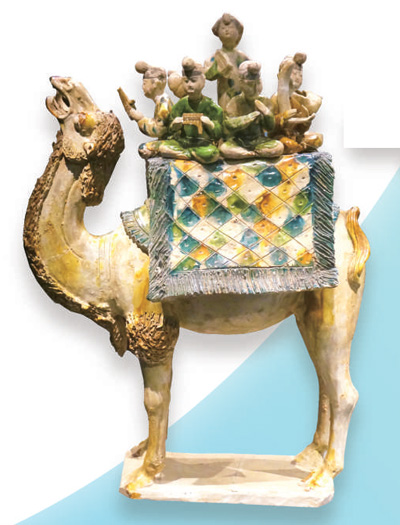 陜西歷史博物館藏三彩載樂(lè)駱駝俑,見證了文化藝術(shù)交融的歷史。一塊色彩斑斕的毛毯置于駝背之上,7名樂(lè)手手持不同樂(lè)器盤腿演奏,中間一女子正動(dòng)情歌唱。一個(gè)“駝背上的樂(lè)隊(duì)”,再現(xiàn)了鮮活的盛唐長(zhǎng)安,各地人們?cè)诖讼嘤?,盡情演繹對(duì)美好生活的追求。