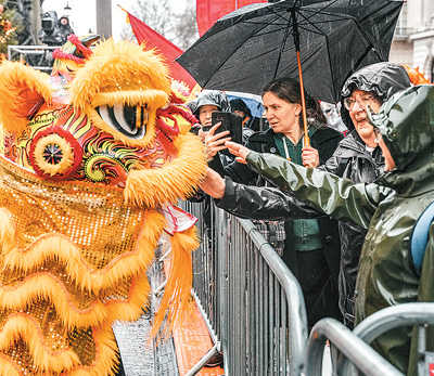 倫敦華埠商會舞獅隊在2025新年巡游中與游客互動。