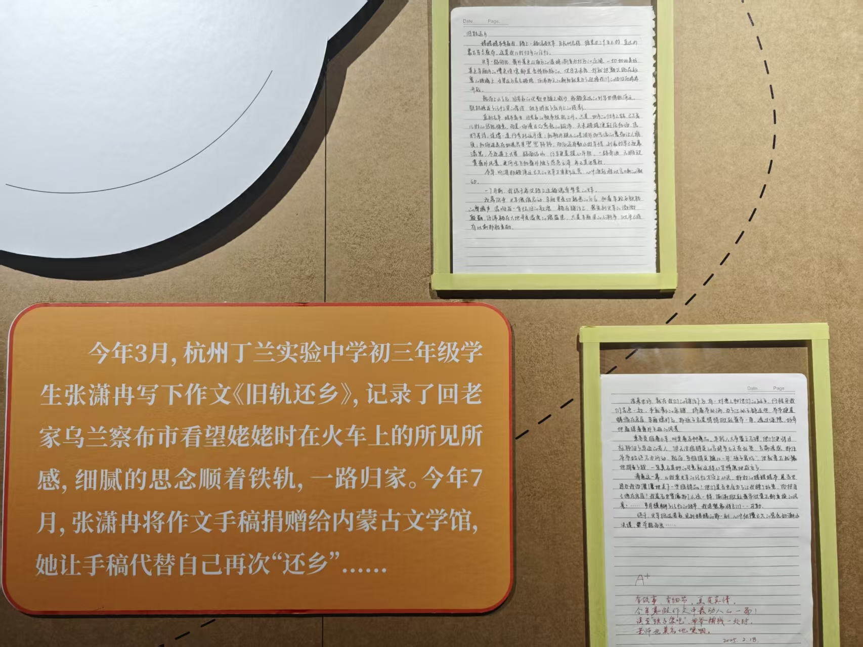 值得一提的是,憑借作文《舊軌還鄉(xiāng)》引起網(wǎng)友廣泛關注和共鳴的內蒙古籍女孩張瀟冉,今年7月將手稿捐贈給了內蒙古文學館,本次展覽對《舊軌還鄉(xiāng)》手稿進行展出。展覽還展出了生于2007年的少女詩人姜二嫚的詩作,年少成名的姜二嫚用7歲時所作的《光》向全國小詩人們送上問候。