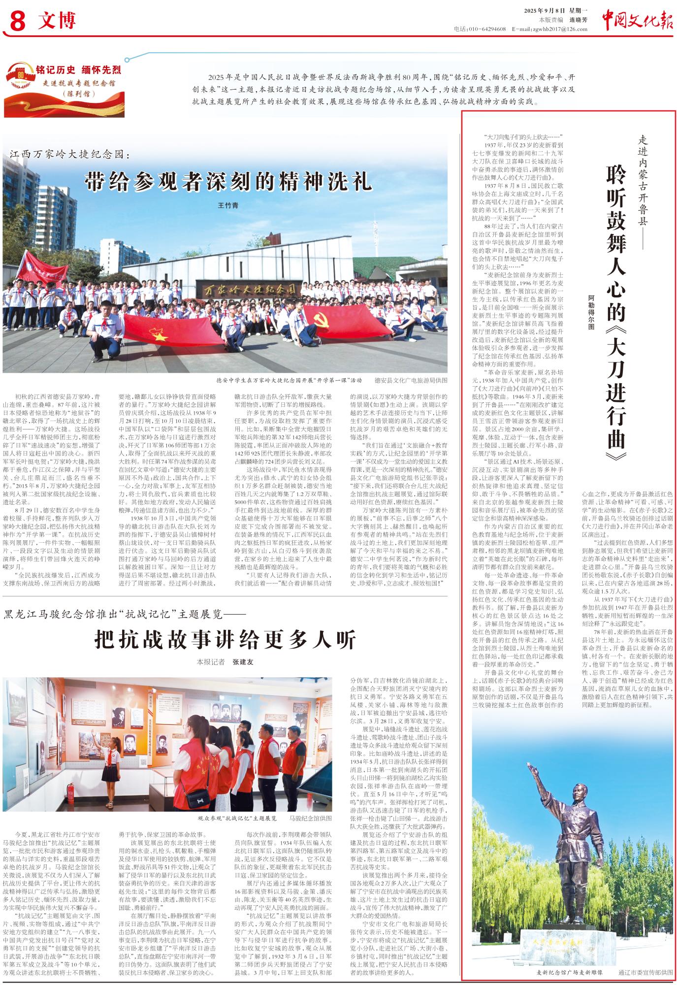 2025年9月8日,《中國文化報》第8版整版刊發(fā)題為《走進內蒙古開魯縣——聆聽鼓舞人心的《大刀進行曲》》的文章,報道了內蒙古開魯縣麥新紀念館以麥新的一生為主線,以傳承紅色基因為宗旨,是目前全國唯一一所全面展示麥新烈士生平事跡的專題陳列展館。經(jīng)過提升改造后,麥新紀念館以全新的觀展體驗吸引眾多參觀者,進一步發(fā)揮了紀念館在傳承紅色基因、弘揚革命精神方面的重要作用。