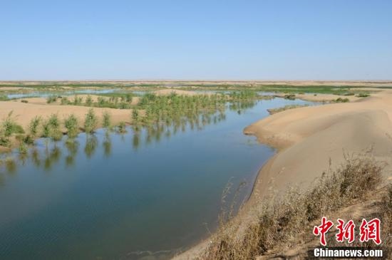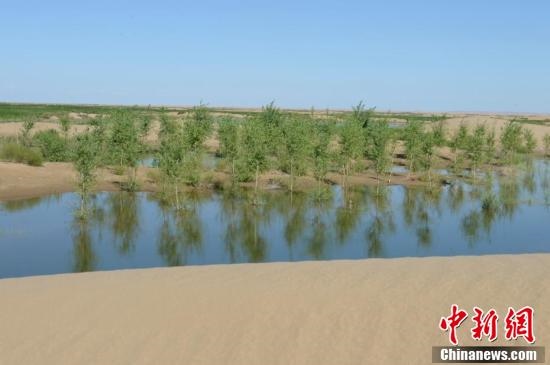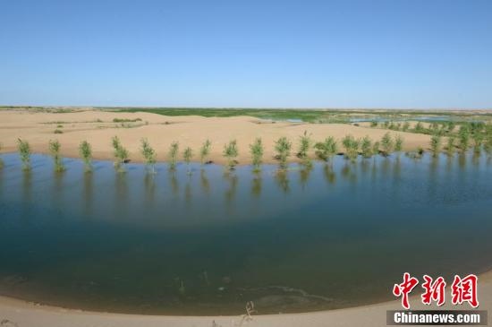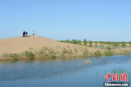 7月24日,引自黃河的凌水讓沙漠上充滿生機(jī)。據(jù)悉,中國(guó)第七大沙漠--庫(kù)布齊沙漠所處的杭錦旗境內(nèi),每年過(guò)境水量310億立方米,當(dāng)?shù)匾荒耆忠坏臅r(shí)間都是凌汛期。政府因地制宜,2016年投資建成分凌引水渠、生態(tài)圍堤等設(shè)施,自2016年至2018年黃河凌汛期以來(lái),累計(jì)分凌5千余萬(wàn)立方米,形成約36平方公里保護(hù)濕地的面積,原來(lái)為沙漠的地貌逐漸變成綠洲,農(nóng)牧民開(kāi)始發(fā)展野牛養(yǎng)殖與農(nóng)家樂(lè)旅游業(yè)。中新社記者劉文華攝