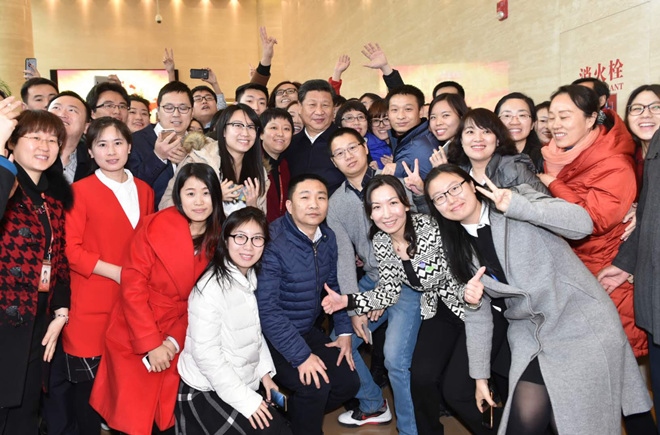2016年2月19日,習(xí)近平到中央新聞單位調(diào)研。圖為習(xí)近平與人民日報(bào)社人民網(wǎng)員工合影。