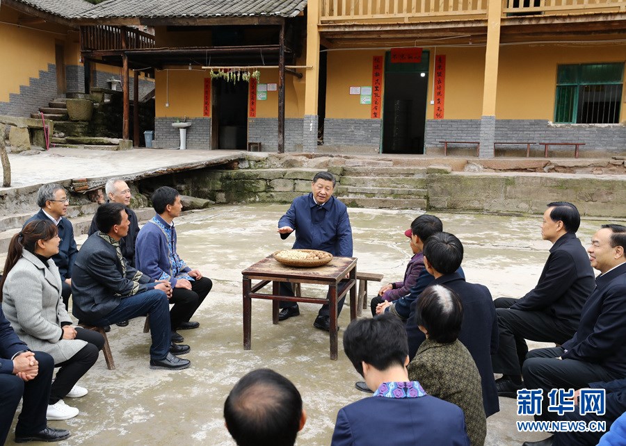 這是4月15日下午,習(xí)近平在石柱土家族自治縣中益鄉(xiāng)華溪村同村民代表、基層干部、扶貧干部、鄉(xiāng)村醫(yī)生等圍坐在一起,共話脫貧攻堅(jiān)。 新華社記者 鞠鵬 攝