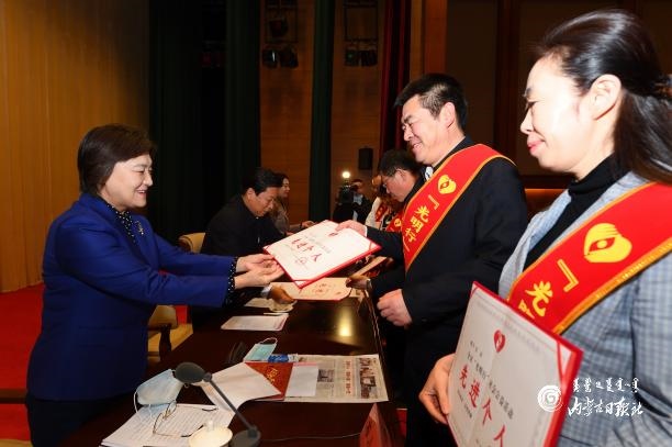 12月14日,全區(qū)“光明行”社會公益活動總結(jié)表彰會在呼和浩特舉行。自治區(qū)主席、紅十字會名譽(yù)會長、全區(qū)“光明行”社會公益活動組委會主任委員布小林為受表彰代表頒發(fā)榮譽(yù)證書。內(nèi)蒙古日報(bào)記者 金泉 攝