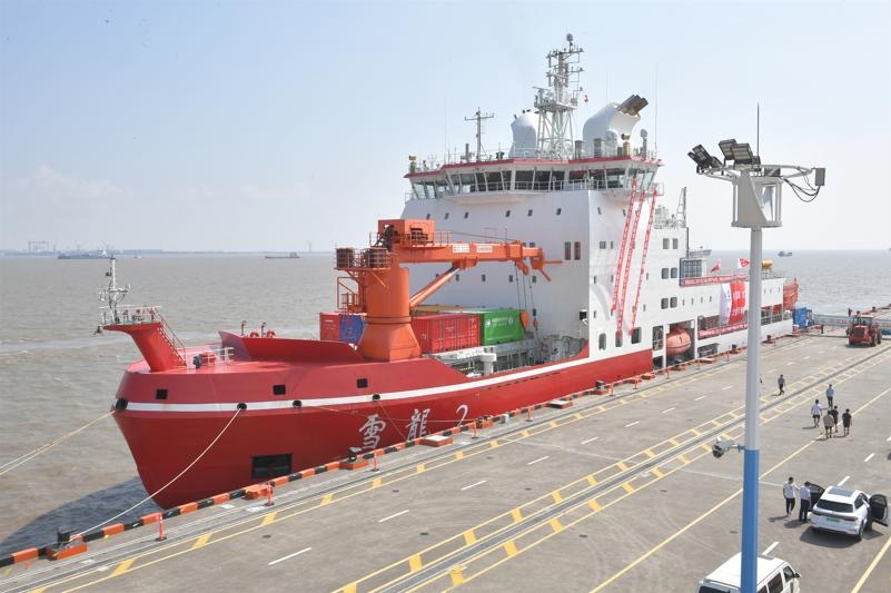 人們?cè)谏虾?guó)內(nèi)基地碼頭歡迎“雪龍2”號(hào)科考破冰船返航。自然資源部供圖