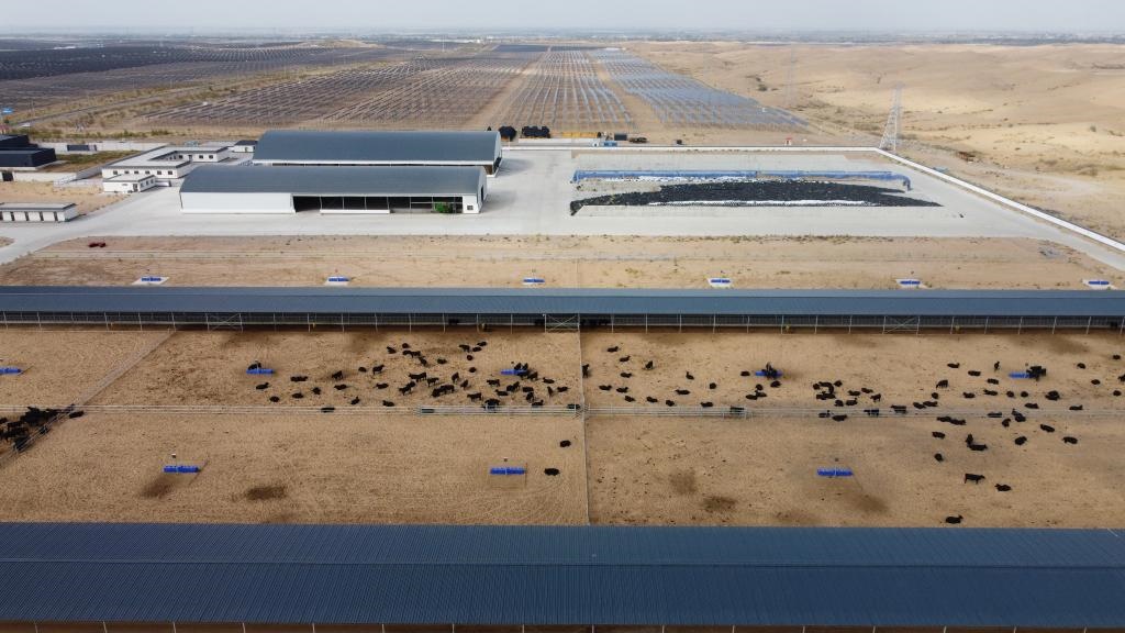 “這是我們?cè)诠夥卮蛟斓难h(huán)經(jīng)濟(jì)項(xiàng)目?!敝行罂萍加邢薰救馀?biāo)準(zhǔn)化養(yǎng)殖場(chǎng)負(fù)責(zé)人石龍說(shuō),養(yǎng)殖場(chǎng)肉牛產(chǎn)生的糞便可以作為光伏基地板間種植作物的肥料,改善沙地土質(zhì)的同時(shí)還能促進(jìn)作物生長(zhǎng),而這些作物又能作為飼料供應(yīng)養(yǎng)殖場(chǎng),循環(huán)發(fā)展的同時(shí)還能促進(jìn)沙漠生態(tài)改善。