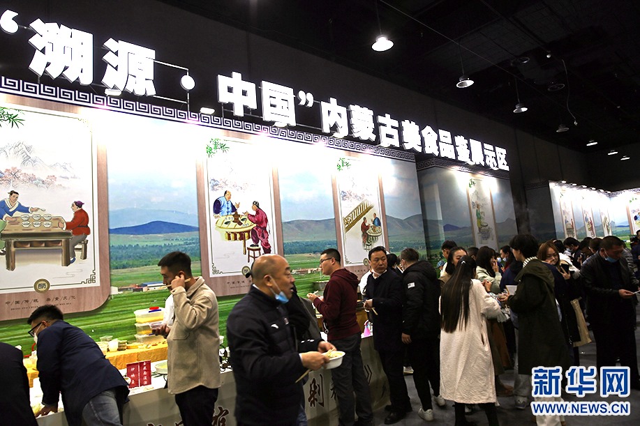 “溯源中國”內蒙古美食品鑒展示區(qū)里,觀眾品鑒內蒙古美食。新華網 石毅 攝