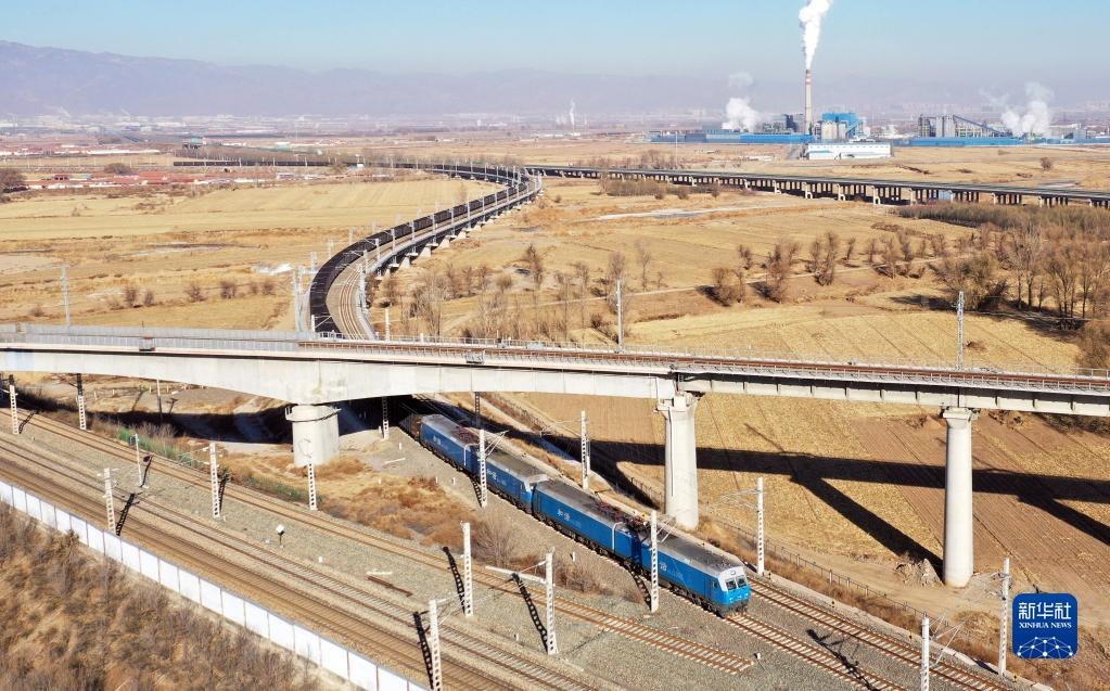 “萬噸煤列”從呼和浩特出發(fā),向東駛?cè)ァ?苗絲雨,2021年11月23日攝)