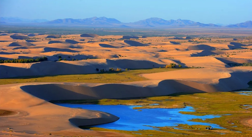 沙區(qū)是我國旅游資源的集中分布區(qū),“大漠孤煙直,長河落日圓”是對雄偉、壯觀、大漠風(fēng)光的寫照,而不同分布區(qū)域的沙漠景觀又各具特色。在內(nèi)蒙古有大面積的草原、森林、沙地、沙漠、河流、湖泊等各類生態(tài)系統(tǒng),共同構(gòu)成了山水林田湖草沙綜合生態(tài)安全屏障。