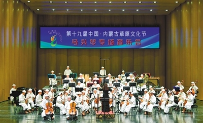 在第十九屆中國·內(nèi)蒙古草原文化節(jié)馬頭琴專場音樂會上,中國烏審馬頭琴交響樂團演奏《草原歡歌》。音樂會分為上半場和下半場,分別由烏審馬頭琴交響樂團和齊·寶力高野馬馬頭琴樂團演奏,為觀眾開啟氣勢磅礴富有草原文化特色的音樂之旅。記者 王磊 攝