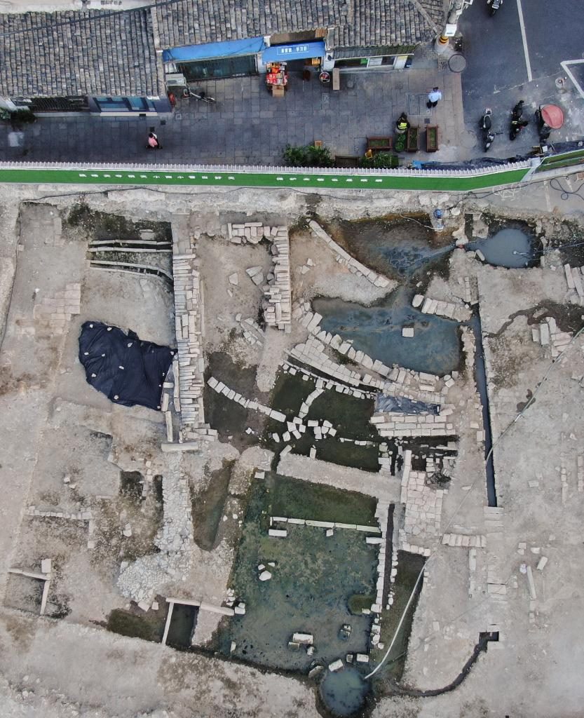 俯瞰朔門古港遺址發(fā)掘出的甕城遺址(10月10日攝,無人機(jī)照片)。新華社記者翁忻旸 攝