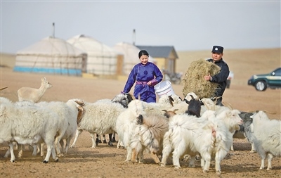 內(nèi)蒙古出入境邊防檢查總站達(dá)日罕烏拉邊境派出所民警幫助轄區(qū)牧民喂羊。記者馬建荃攝