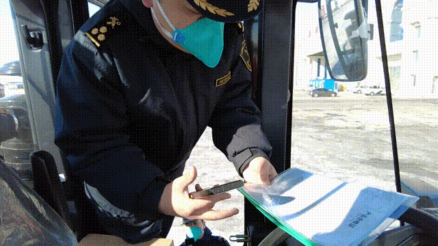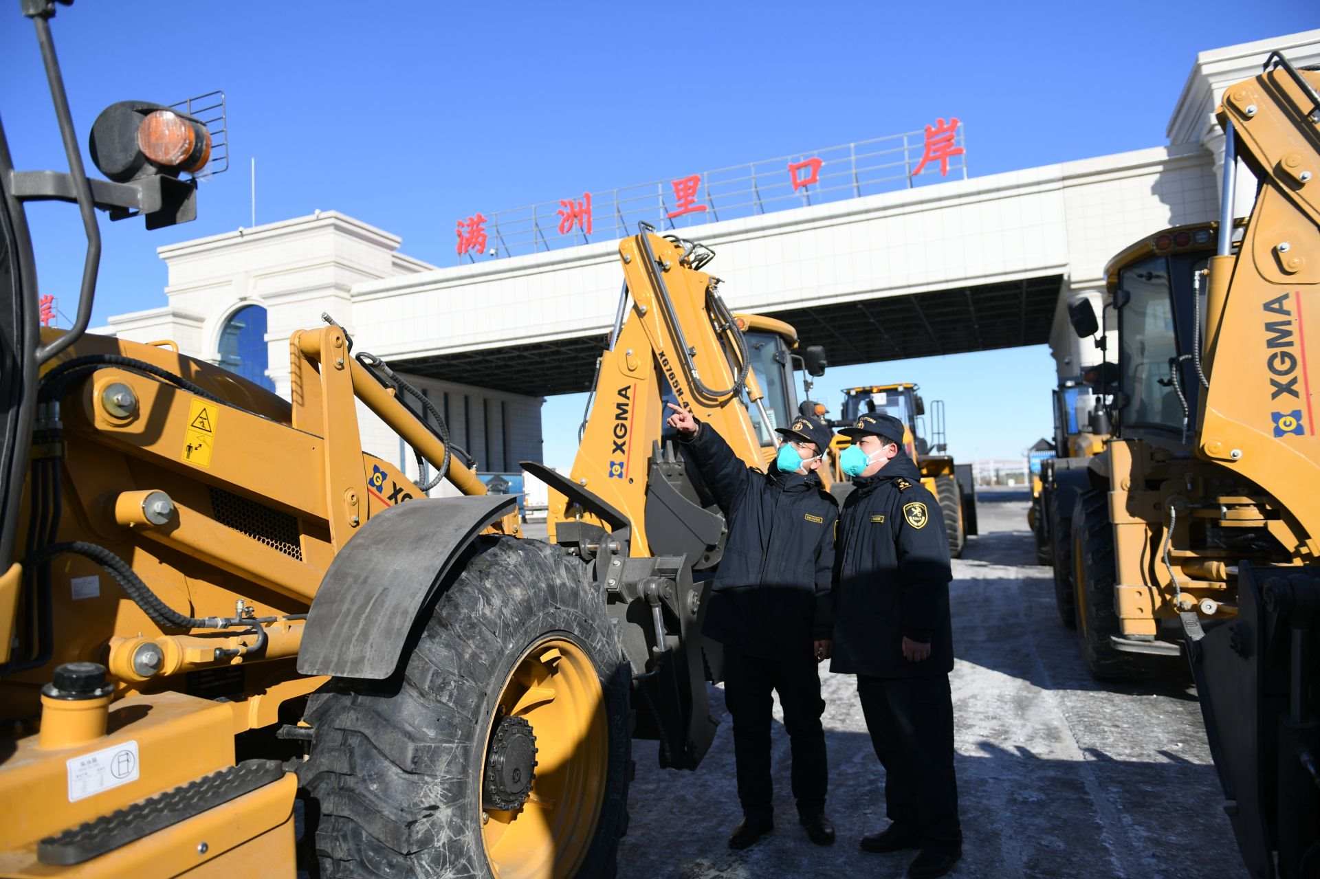 海關(guān)工作人員正在對出口工程機械車輛進行登臨檢查。