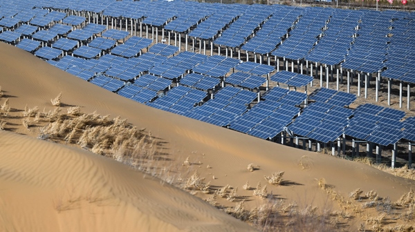 在鄂爾多斯市達拉特旗昭君鎮(zhèn)柴磴嘎查,346萬塊藍色光伏板隨著綿延的庫布其沙漠起伏,像陣陣波濤,在漫漫沙海中匯成3000萬平方米的光伏“海洋”。走在3米高的光伏架下,達拉特旗委書記張秀玲高興地介紹:“這里種的是1.2萬畝紅棗,那邊是5000畝黃芪和黃芩,更遠處是1.9萬畝的優(yōu)質(zhì)牧草。沙窩里種上作物,再從上面架起光伏板,相當(dāng)于打了兩層‘保護傘’,黃沙休想亂跑?!?/p>