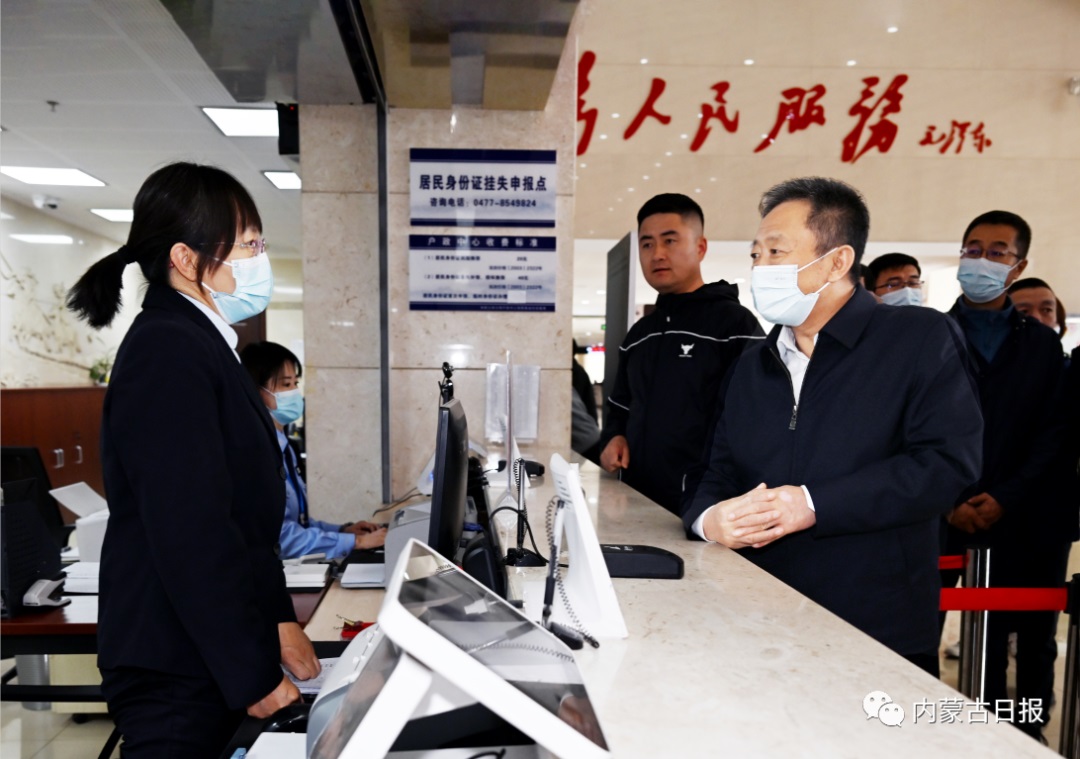 4月21日,孫紹騁在鄂爾多斯市東勝區(qū)政務(wù)服務(wù)中心向窗口工作人員詢(xún)問(wèn)便民服務(wù)情況。內(nèi)蒙古日?qǐng)?bào)社融媒體記者馬建荃攝