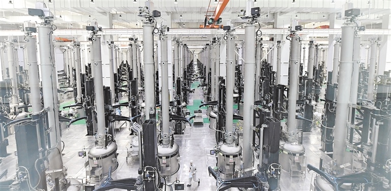 “這個(gè)車間出來的單晶硅棒是用在光伏領(lǐng)域的,切成硅片后,應(yīng)用于下游的電池片、組件、電站?!眱?nèi)蒙古中環(huán)晶體材料有限公司技術(shù)總監(jiān)王林告訴記者。