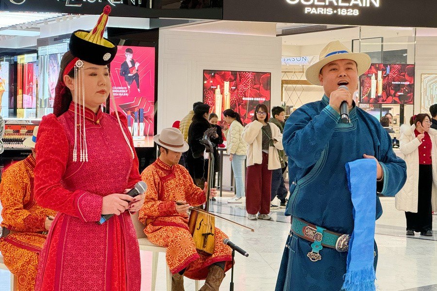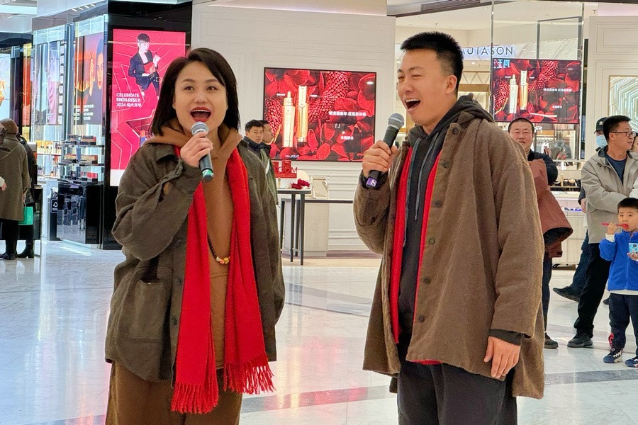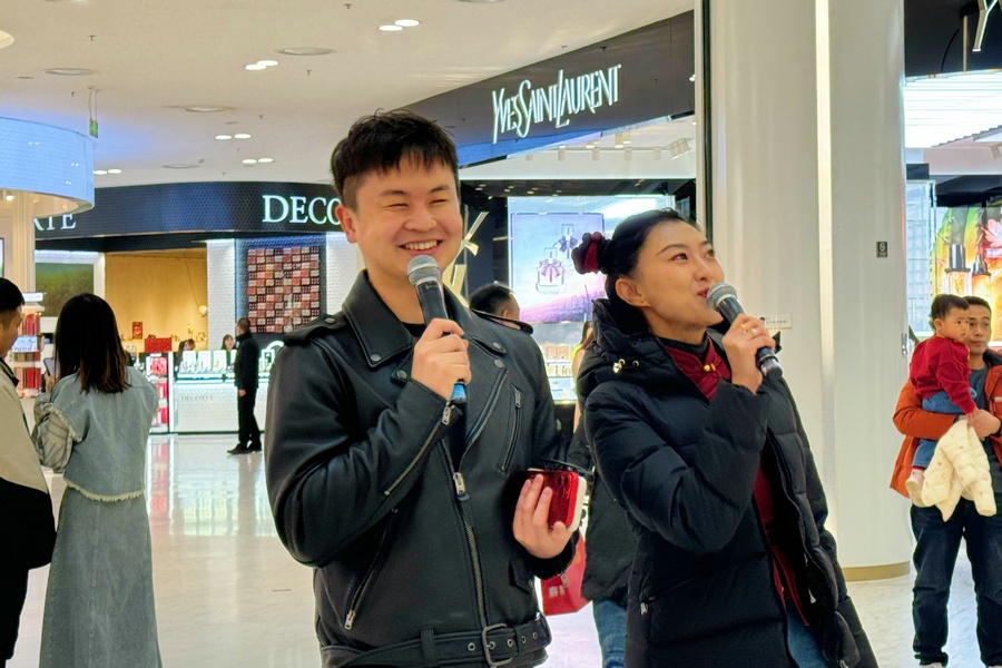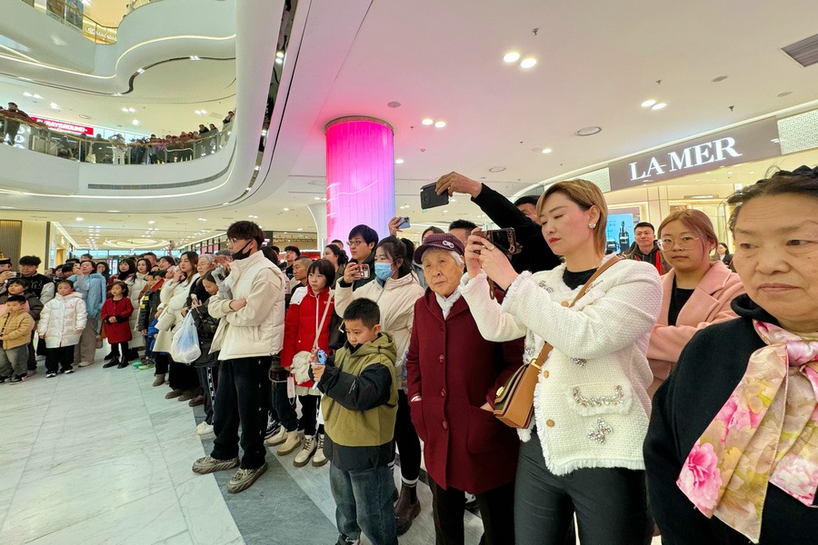 當(dāng)天是甲辰龍年正月初五,商場(chǎng)里闔家出行的市民和外地游客絡(luò)繹不絕,大家興致盎然地圍觀了演出。