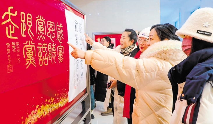 各類參展作品掛在以紅色為底的展板上,新年的氛圍感瞬間拉滿?!芭e辦這次活動(dòng)特別有意義,真的很喜歡這種文化氛圍。”內(nèi)蒙古自治區(qū)第八屆道德模范獲得者鄭洪山邊看邊說(shuō)。