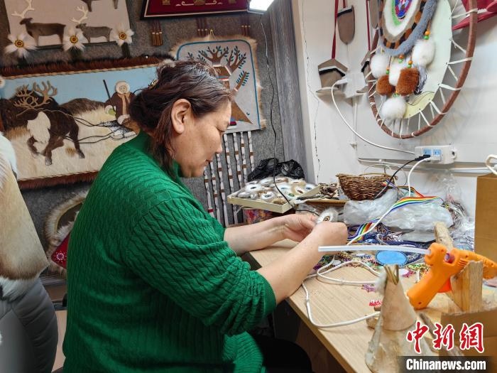 2月21日,在內(nèi)蒙古呼倫貝爾市鄂溫克族自治旗一家手工藝品工作室內(nèi),烏仁在制作太陽花手工藝品。   于嘉  攝