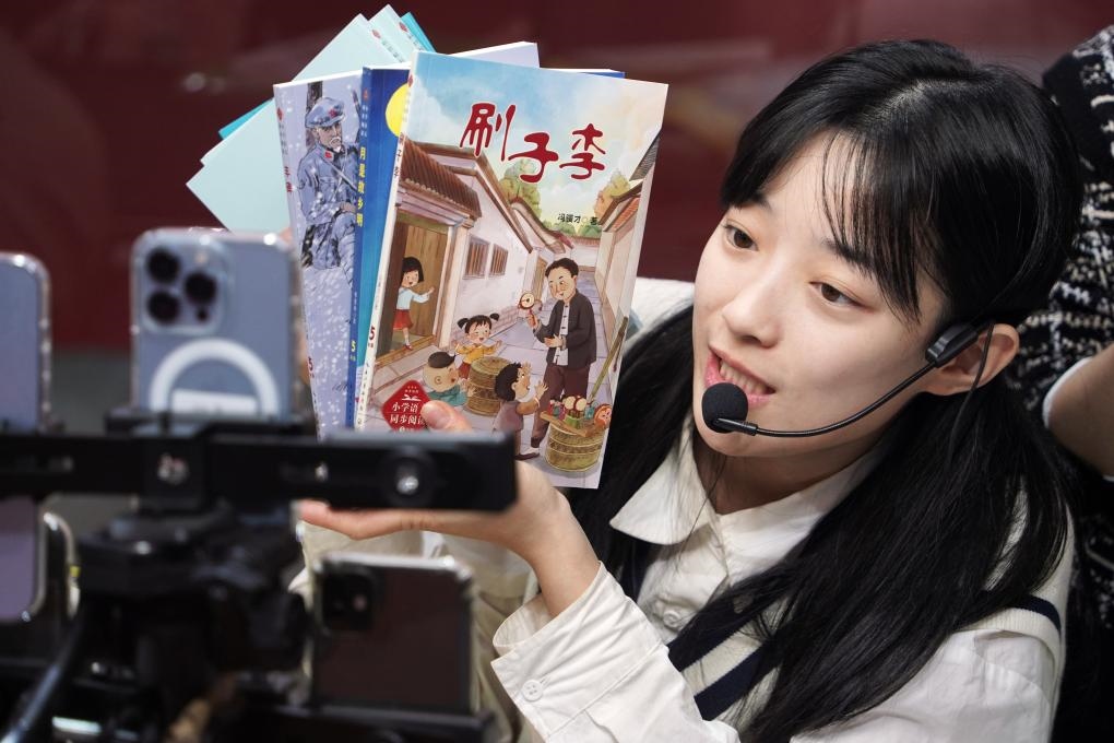 ??1月11日,一名主播在2024北京圖書訂貨會(huì)直播推介圖書。新華社記者 潘旭 攝