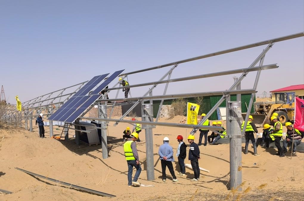 記者在新華林場民樂作業(yè)區(qū)看到,與其他作業(yè)區(qū)的造林治沙方式相比,這里既沒有栽樹,也沒有種草,而是在沙地里“栽”下了一個個水泥樁。葛文斌告訴記者:“這里是防沙治沙和風(fēng)電光伏一體化工程項目區(qū)。‘栽’水泥樁就是為后期安裝光伏板、建設(shè)光伏電站做準備。在光伏板上發(fā)電的同時,我們還可以在光伏板下種植固沙植物,幫助地表植被恢復(fù),達到既能發(fā)電‘生金’又能實現(xiàn)沙化土地縮減的雙重功效?!保ㄓ浾呃钤破健⒑罹S軼)