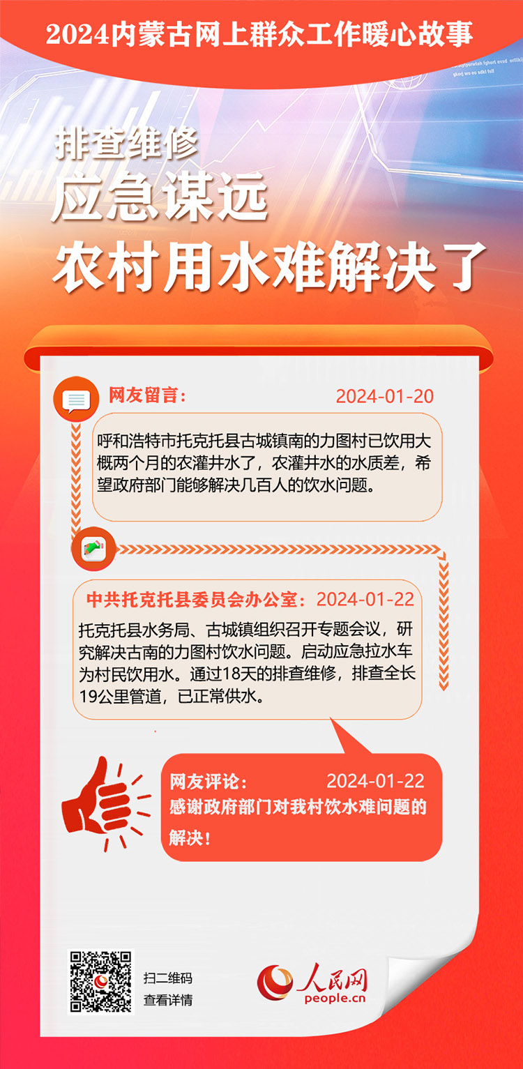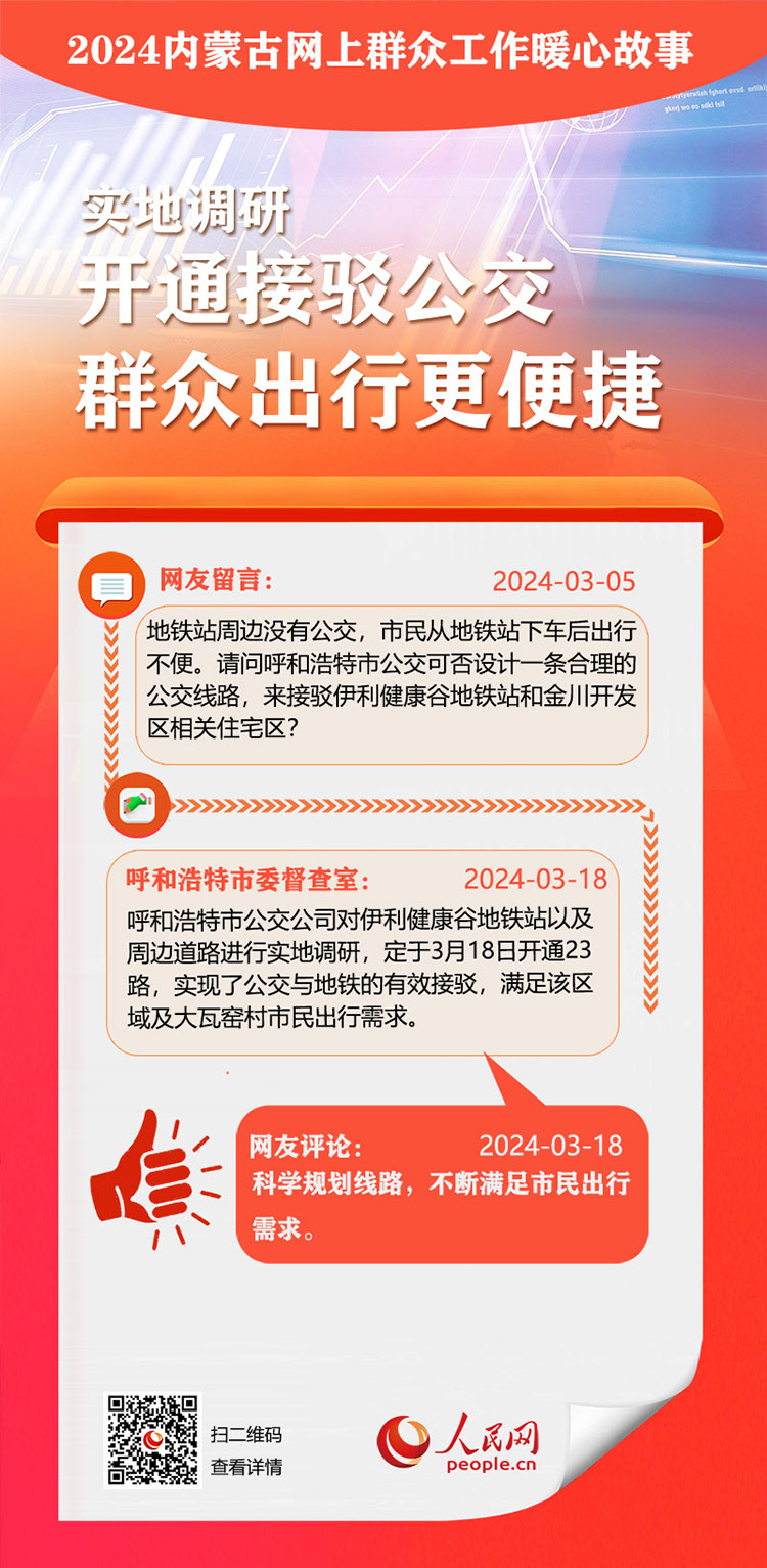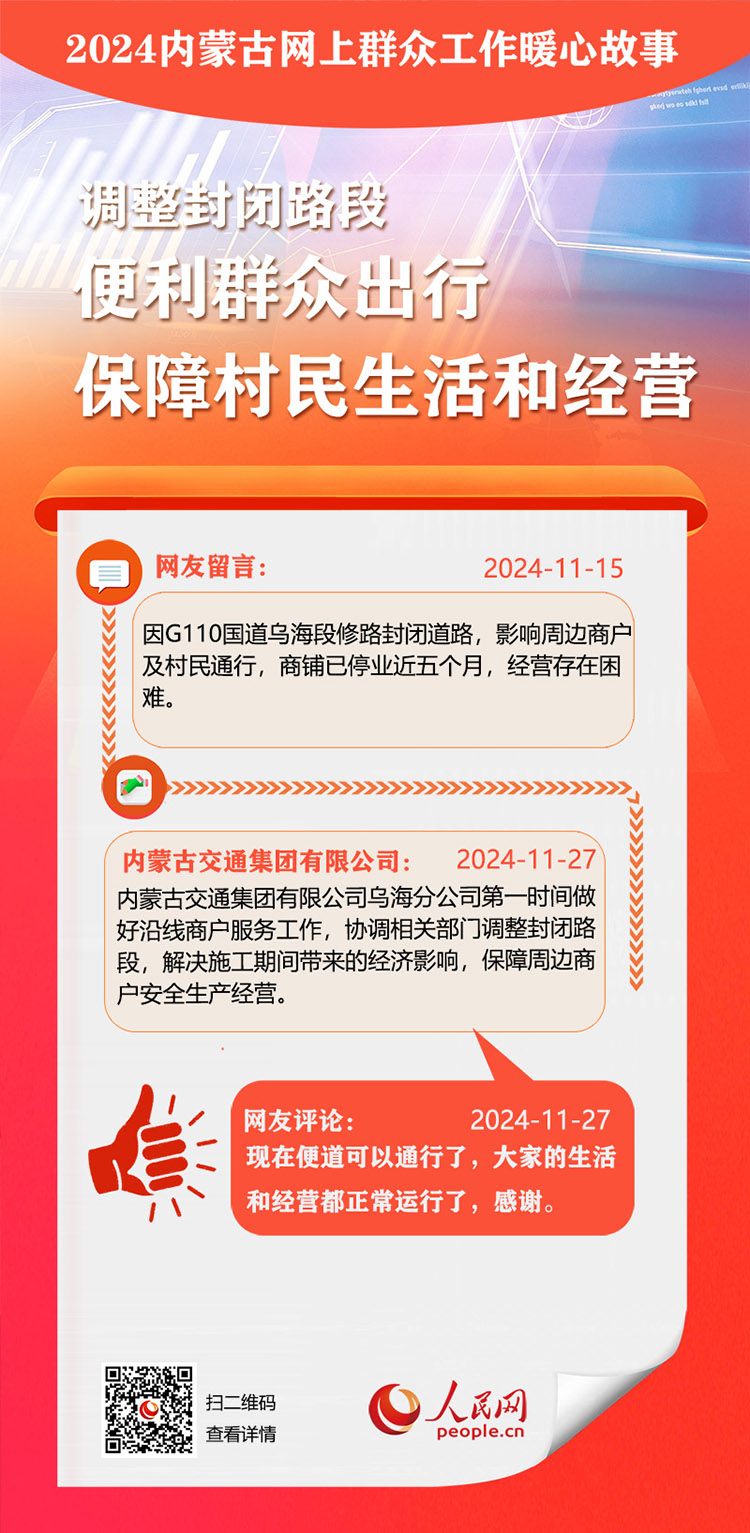 走好走實(shí)網(wǎng)上群眾路線 用心用情為民服務(wù)辦實(shí)事。依托人民網(wǎng)“領(lǐng)導(dǎo)留言板”,內(nèi)蒙古自治區(qū)各級(jí)黨委、政府著力解決網(wǎng)民反映的熱點(diǎn)難點(diǎn)。2024年,一批群眾關(guān)切的急難愁盼問(wèn)題得到及時(shí)解決。人民網(wǎng)內(nèi)蒙古頻道推出特別策劃,盤點(diǎn)過(guò)去一年內(nèi)蒙古網(wǎng)上群眾工作那些暖心事。