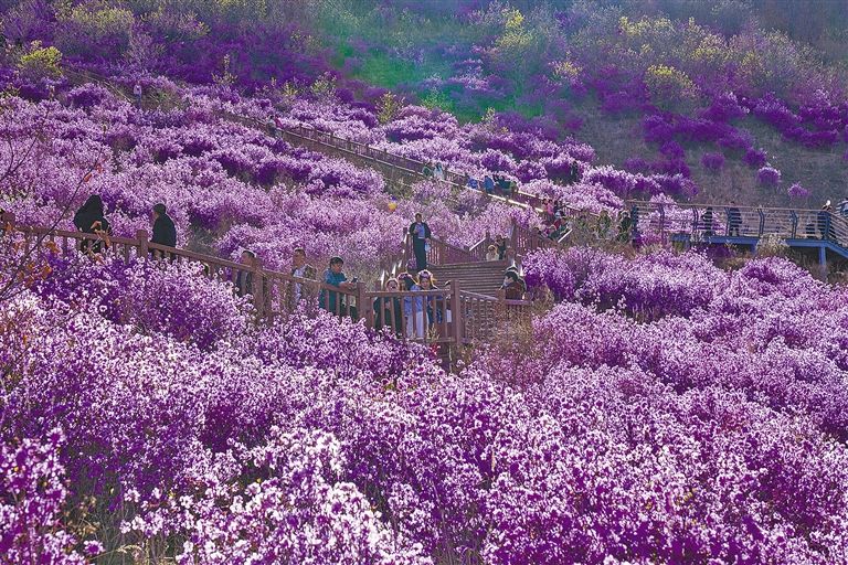 游客在扎蘭屯市欣賞杜鵑花。