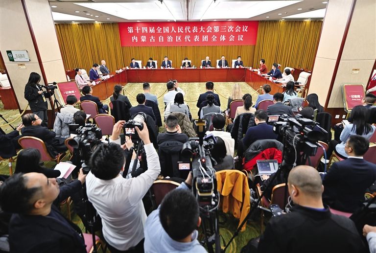 3月6日下午,十四屆全國人大三次會議內(nèi)蒙古代表團(tuán)在駐地舉行全團(tuán)會議,本次全團(tuán)會議向參加全國兩會報道的中外媒體開放。蓬勃發(fā)展的亮麗內(nèi)蒙古吸引了29家中外媒體的57名記者到場采訪,感受內(nèi)蒙古發(fā)展的蓬勃力量,講述全區(qū)上下深入落實習(xí)近平總書記的重要指示精神,貫穿一條主線,辦好兩件大事,弘揚蒙古馬精神,闖新路進(jìn)中游的改革故事。