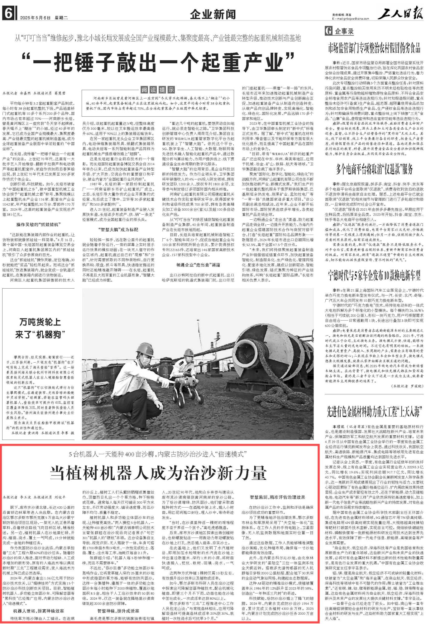 2025年5月6日,《工人日?qǐng)?bào)》第6版刊發(fā)題為《當(dāng)植樹機(jī)器人成為治沙新力量》的文章,報(bào)道了內(nèi)蒙古作為我國防沙治沙主戰(zhàn)場(chǎng),承擔(dān)著“三北”工程六期60%的治沙任務(wù)。隨著防沙治沙的深入推進(jìn),智能植樹機(jī)器人、多功能立體固沙車、可降解容器等“黑科技”已經(jīng)推廣應(yīng)用,內(nèi)蒙古防沙治沙進(jìn)入“倍速模式”。