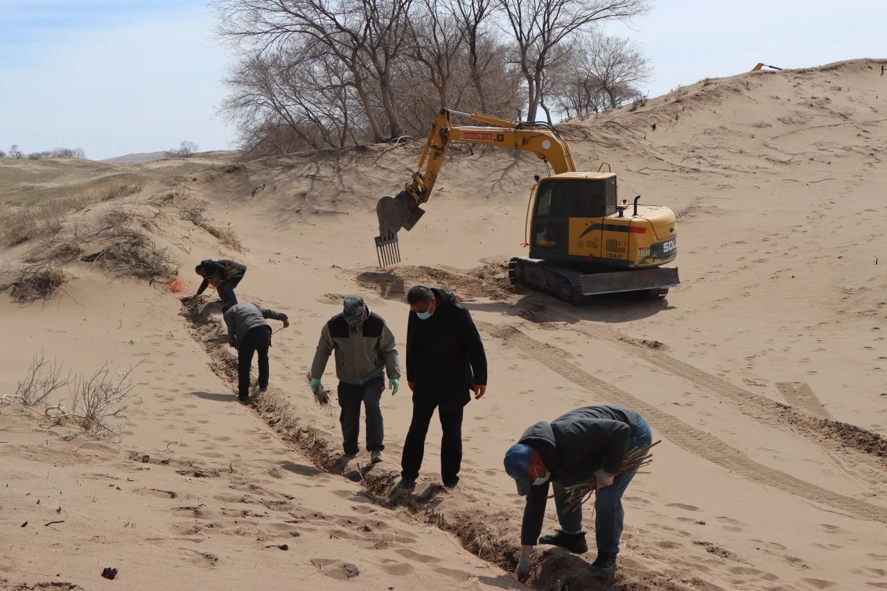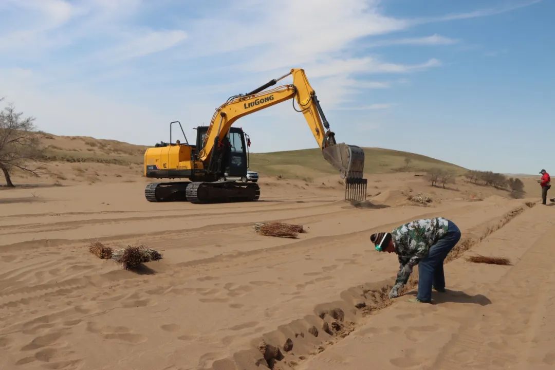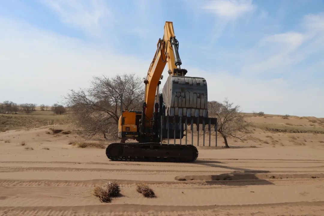 據(jù)錫林浩特市二蛋牧民養(yǎng)殖專業(yè)合作社負(fù)責(zé)人介紹,在傳統(tǒng)的沙漠治理作業(yè)中,工人需要手動栽植黃柳等固沙植物。然而,人工種植不僅效率低,勞動強(qiáng)度也大。為突破這一困境,合作社成員經(jīng)過多次試驗(yàn),最終決定對挖掘機(jī)進(jìn)行創(chuàng)新改造,加裝叉具,這一巧妙的設(shè)計不僅實(shí)現(xiàn)了對黃柳種植深度和間距的精準(zhǔn)把控,還能有效避免土壤翻動,最大程度地保持了土壤水分,切實(shí)保護(hù)了沙地的生態(tài)環(huán)境?! ?/p>