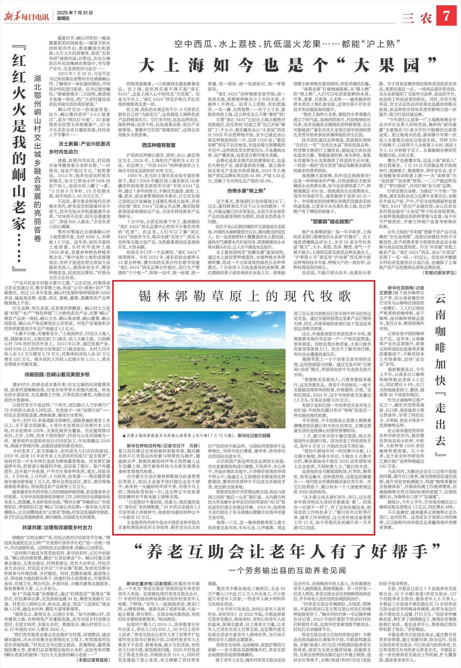 2025年7月31日,《新華每日電訊》第7版刊發(fā)題為《錫林郭勒草原上的現(xiàn)代牧歌》的文章,報道了夏日的風(fēng)拂過無垠的錫林郭勒草原,隨風(fēng)飄來的不只有悠遠的牧歌與嗒嗒的馬蹄聲,鍵盤敲擊聲、智能機械低鳴聲等正悄然融入這片邊疆土地,現(xiàn)代畜牧科技與全新發(fā)展理念奏響草原現(xiàn)代牧歌。