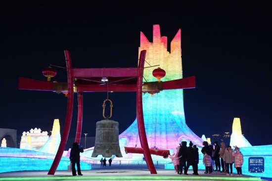 2月25日,游客在哈爾濱冰雪大世界園區(qū)拍照。