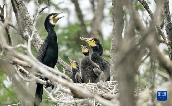 準(zhǔn)備學(xué)習(xí)飛翔的幾只鸕鶿幼鳥棲息在密云水庫“鳥島”的樹上(5月31日攝)。