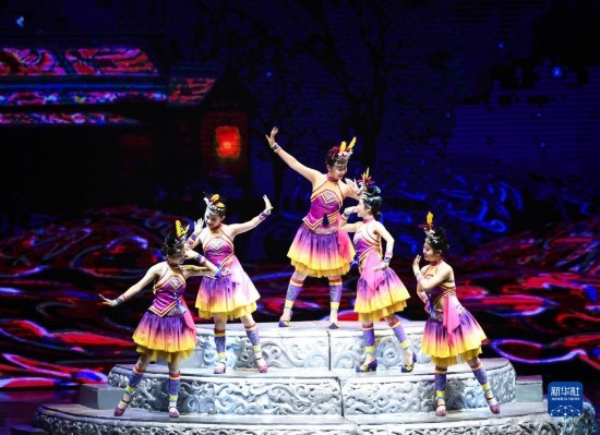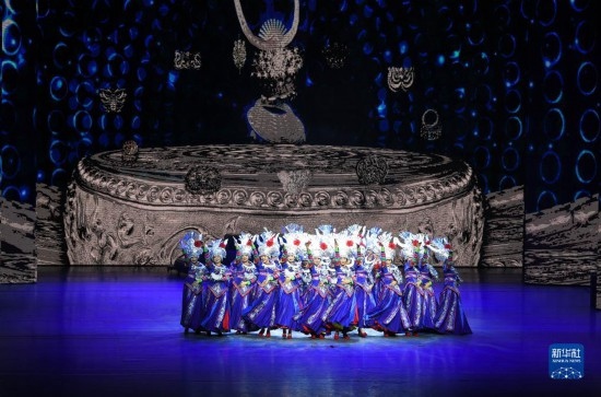 6月5日,演員在貴陽大劇院的《多彩貴州風(fēng)》演出中表演節(jié)目《踩鼓舞》。