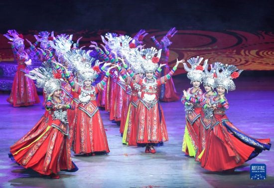 6月5日,演員在貴陽大劇院的《多彩貴州風(fēng)》演出中表演節(jié)目《金繡銀飾》。