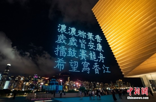 6月22日晚間,“紫荊花之夜”無人機燈光創(chuàng)意秀在香港故宮文化博物館畔的海面上空舉行,2000架無人機演繹多個與“端午節(jié)”相關(guān)的圖案,點亮香港夜空。圖為無人機組成端午節(jié)寄語。