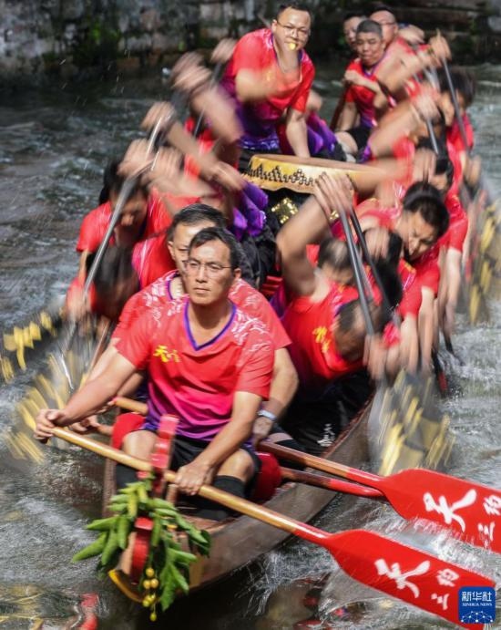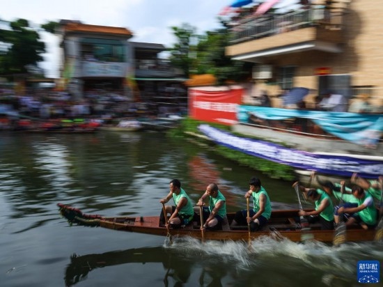 6月22日,“扒仔”(槳手)在佛山疊滘端午龍船漂移賽上奮力揮槳。