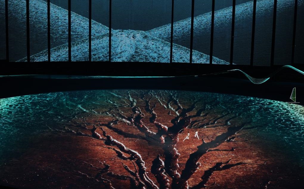 本屆亞運會首次將3D雙威亞技術(shù)應用于大型運動場中。立體飛旋于空中的男女演員與潮共舞,吊著威亞的他們在空中完成了各種高難度動作,并與地屏中的浪潮實時互動,踏浪而行,成就了科技與藝術(shù)完美融合。