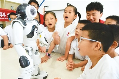 7月18日,江蘇大學(xué)志愿者來到鎮(zhèn)江市官塘橋街道,為當(dāng)?shù)匦∨笥蜒菔静⒅v解各種機(jī)器人的功能和操作方法,充實孩子們的暑假生活。石玉成攝(人民圖片)