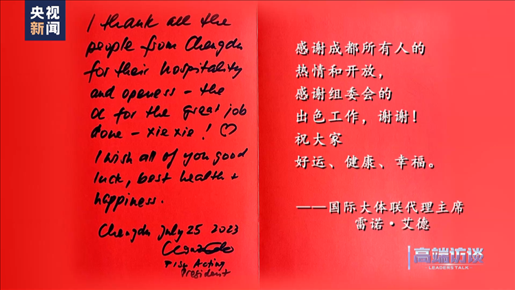 國(guó)際大體聯(lián)代理主席雷諾·艾德在接受總臺(tái)專(zhuān)訪后題詞:感謝成都所有人的熱情和開(kāi)放,感謝組委會(huì)的出色工作,謝謝!祝大家好運(yùn)、健康、幸福。
