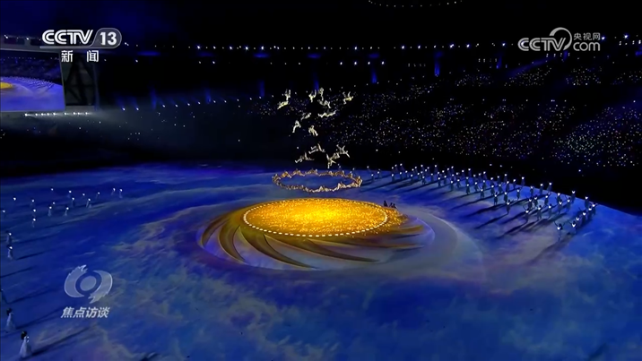 在開幕式入場(chǎng)環(huán)節(jié),運(yùn)動(dòng)員腳下是一條“錦繡之路”。投影打出的七彩絲線流淌到地面上,300多個(gè)環(huán)線鋪滿整個(gè)體育場(chǎng)跑道。