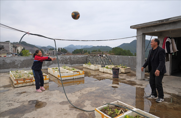 3月27日,李文文在屋頂露臺和父親玩投籃游戲。李文文是貴州臺江縣臺盤鄉(xiāng)中心小學(xué)的女籃隊(duì)長,以前他的父親在外地務(wù)工,如今火爆全網(wǎng)的“美麗鄉(xiāng)村”籃球聯(lián)賽給臺盤鄉(xiāng)帶來了人氣,父親在家門口就能找到工作。