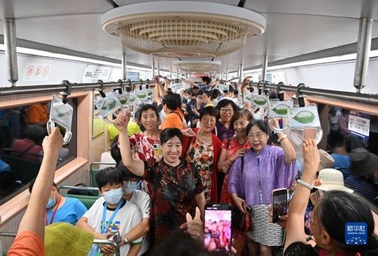 從8月8日起,北京地鐵一號(hào)線(xiàn)開(kāi)行“時(shí)光列車(chē)”,6節(jié)車(chē)廂采用不同時(shí)代涂裝風(fēng)格。特別是綠色座椅、車(chē)廂頂部風(fēng)扇等元素,帶領(lǐng)乘客瞬間“穿越”,吸引人們紛紛打卡拍照?!皶r(shí)光列車(chē)”運(yùn)行時(shí)間是工作日14點(diǎn)至15點(diǎn),運(yùn)行區(qū)間是地鐵古城站至地鐵復(fù)興門(mén)站。