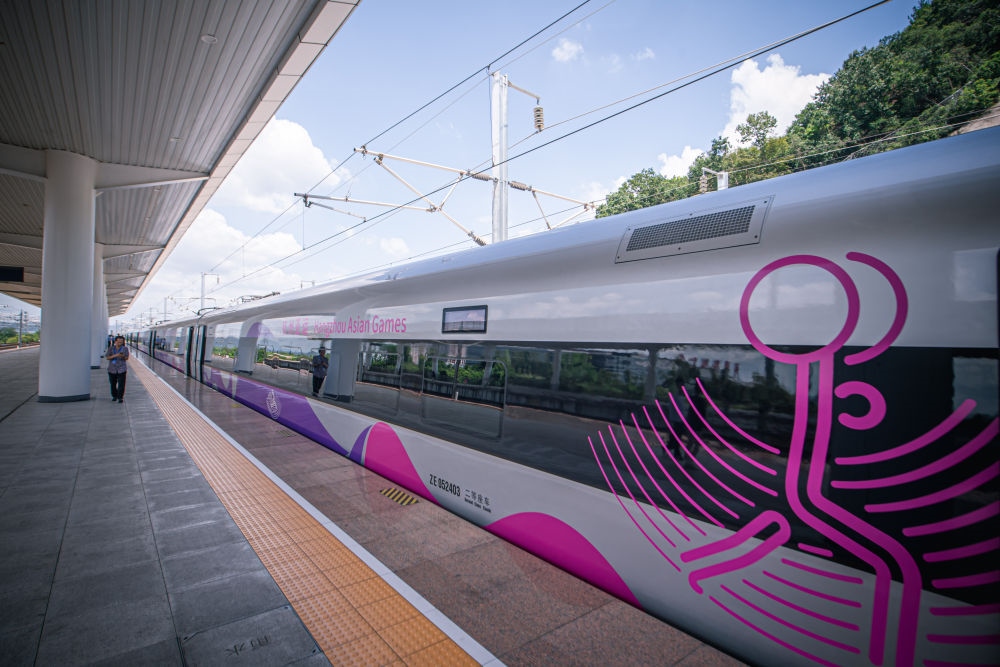 這是亞運(yùn)智能動車組??吭诘虑逭菊九_(2023年8月4日攝)。新華社記者 江漢 攝