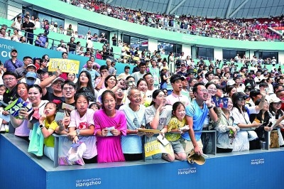 9月29日,杭州亞運(yùn)會(huì)網(wǎng)球女子單打決賽現(xiàn)場,觀眾在歡呼。本報(bào)記者陳城攝 光明圖片