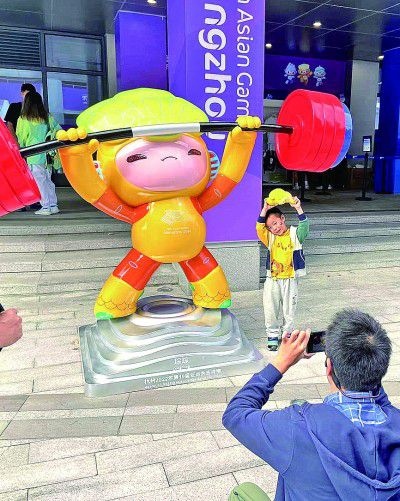 拱墅運(yùn)河體育公園體育館外的杭州亞運(yùn)會(huì)吉祥物。本報(bào)記者 陳茵攝/光明圖片